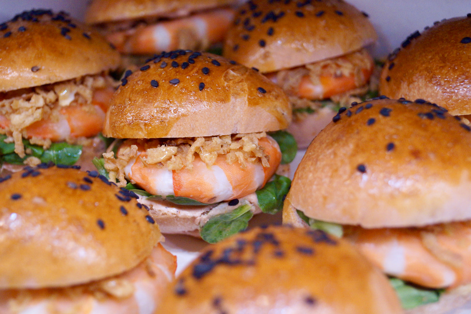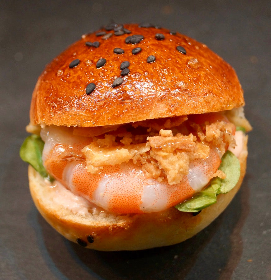 Laissez-vous séduire par une bouchée audacieuse où la douceur de la crevette rencontre la générosité d’un pain maison moelleux. Une sauce maison subtilement relevée s’allie à la douceur du miel pour un équilibre sucré-salé délicat, tandis que les oignons frits apportent une touche croustillante et gourmande. Quelques feuilles de roquette viennent parfaire l’ensemble d’une note poivrée et fraîche. Une création savoureuse et élégante, idéale pour éveiller les papilles à l’apéritif.
